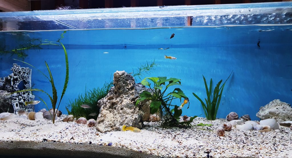 Slutresultat: mängder av guppy (såklart), säkert 100-150 stycken, de var kanske 25 från början, 6 Kardinalfiskar, 5 Mel. Praecox, 2 Doadrioi, 2 Ancistrus ’Super red’, ett 20-tal blåa posthornssnäckor och runt 30 Körsbärsräkor. Doadrioi var den enda art som inte verkade trivas i dammen.