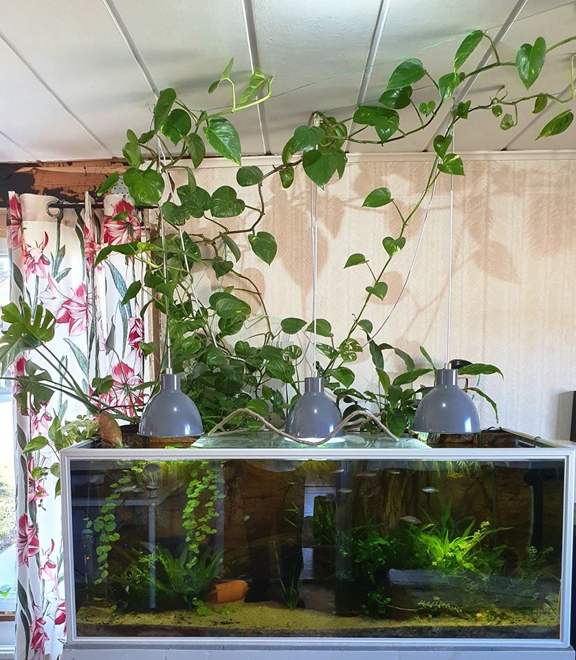 Sötpotatis, Monstera Deliciosa, Monstera Monkey Mask, Fredskalla (Spathiphyllum alana) och lite annat ovanpå. Regnbågsfiskar (M. Parkinsoni, M. Herbertaxelrodi och M. Lacustris), Nyckelhålsciklider och Garra Flavatra inuti.